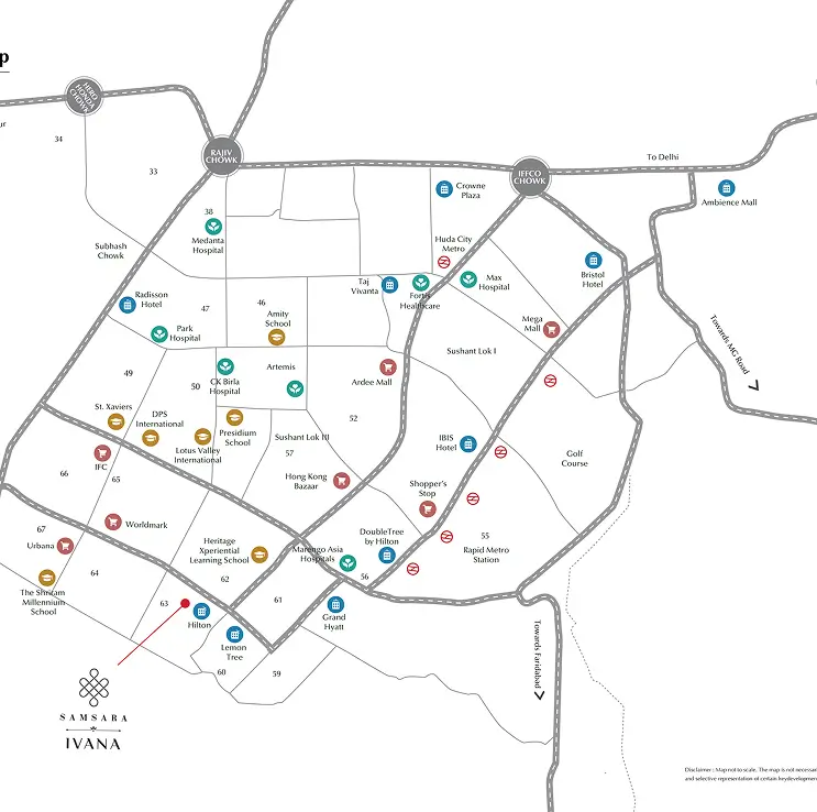 Samsara Ivana Sector 63 Gurgaon is situated in one of Gurgaon’s fastest-developing zones, along the prime Golf Course Extension Road. This area hosts a range of luxury projects and offers robust connectivity via NH-48, Sohna Road, Rapid Metro, and the upcoming metro corridor. Educational institutions, hospitals, malls, and offices are located within minutes.